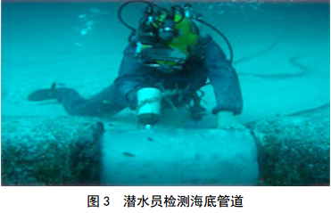 目前國內(nèi)主要采用聲學調(diào)查設備對管道路由位置、埋設狀況及周邊地形地貌進行定期檢測,無法判斷管道的陰極保護狀況。南海一些非掩埋深水管道,水下能見度較高,通過潛水員或ROV(水下機器人)定期檢測位于海床面管道上的陽極,來了解和掌握海底管道陽極工作狀態(tài)(圖 3)。