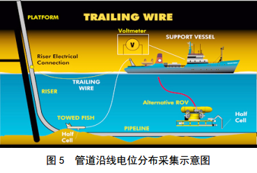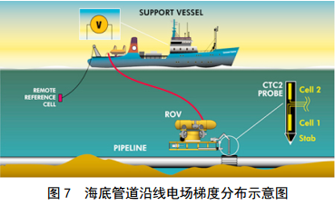 管道沿線電位分布測量,即密間隔電位測試(Close Interval Potential Survey, CIPS)是判斷管道陰極保護有效性的主要技術,在陸上埋地管道檢測中得到廣泛應用,國外也已經(jīng)應用在海底管道領域,檢測示意如圖 5所示。