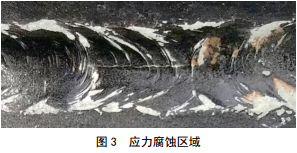 管道應力腐蝕區(qū)域,呈現(xiàn)特殊類型的細、淺和分 枝開裂,常發(fā)生在涂層失效時,特別是無有效的陰極防護措施時,如圖 3所示。