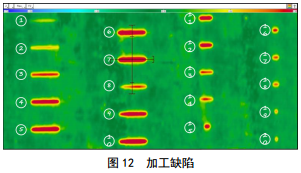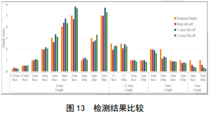 經檢測所有加工缺陷,在0.25~3.00 mm深度范圍內,檢測誤差+/-10%;同時也通過了最大提離2mm驗證。但對于長度短于5 mm的較小缺陷,特別是長度與深度比小于3的缺陷,檢測結果略微偏小。結果如圖 13所示。