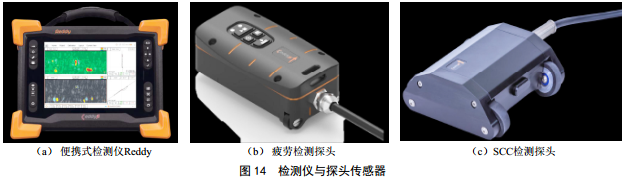 根據(jù)切向渦流原理,提出了一套完整的專用解決方案;設計了專為現(xiàn)場使用的便攜式檢測儀Reddy®;開發(fā)了嵌入式Magnifi軟件;開發(fā)了SharckBW探頭用于管道焊縫的疲勞開裂、 sharck HR探頭用于管道母材的SCC,如圖 14所示。
