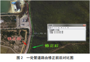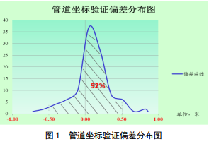 通過集成應(yīng)用工程測量、智能檢測、航空攝影測量、地下管線探測、數(shù)據(jù)比對、坐標(biāo)修正與轉(zhuǎn)換六項技術(shù),解決了在役管道難以獲取必要的基礎(chǔ)性數(shù)據(jù)問題,獨創(chuàng)3S技術(shù)集成應(yīng)用。運用該技術(shù)對某管道全線開挖驗證105個點,數(shù)據(jù)偏差全部在±0.86米以內(nèi),其中在±0.5米之內(nèi)的占92%(圖 1),實現(xiàn)管道大量基礎(chǔ)數(shù)據(jù)校準(zhǔn)與更新,例如圖 2為一處管道路由修正前后對比圖,最終使管道中線坐標(biāo)偏差控制在±1米以內(nèi)。