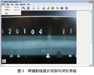 開展焊縫圖像的缺陷特征提取和自動識別。對數(shù)字化圖像進行預處理,并采用邊緣檢測、缺陷跟蹤、圖像增強、線性變換、圖像形態(tài)學處理、算子融合等方法,獲取圖像的紋理特征,計算出缺陷圖像特征值,對焊縫缺陷特征進行提取。自動對缺陷類型進行分類,如裂紋、未焊透、未熔合、圓形缺陷、條形缺陷等。最小識別缺陷尺寸特征應不大于1 mm。焊縫射線底片識別與評價系統(tǒng)如圖 3所示。系統(tǒng)功能如圖 4所示。缺陷識別分析過程如圖 5所示。