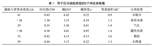 (5)數(shù)字化底片分析識別。依據(jù)NB/T 47013.2―2015標準,對數(shù)字化底片中存在的基礎(chǔ)信息進行預處理,采用邊緣檢測與閾值分析的方法提取特征參數(shù),提取的參數(shù)采用典型缺陷SVM多類分類器方法構(gòu)造函數(shù),對其中存在的焊縫缺陷進行分析、識別。如裂紋、未焊透、未熔合、圓形夾渣、條形夾渣等缺陷,利用表 1所示的5個特征參數(shù)集劃分缺陷類型,并對其可接受性進行評價。