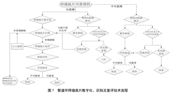 (2)焊縫底片數(shù)字化、識別及復評技術(shù)流程。根據(jù)焊縫射線底片可獲得性,可以找到管道焊縫射線底片的部分;無焊縫射線底片的部分。技術(shù)流程如圖 7所示,可篩選出需要重點關(guān)注的焊縫、建設(shè)期多余的底片以及無底片的焊縫。