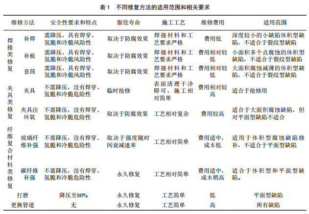 管道本體修復(fù)技術(shù)主要遵循 QSY 1592―2013《油氣管道管體修復(fù)技術(shù)規(guī)范》。修復(fù)方法的適用范圍和要求詳見(jiàn)表 1。