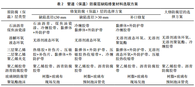 管道外防腐保溫層修復(fù)主要遵循的標(biāo)準(zhǔn)是 SY/T 5918―2011《埋地鋼質(zhì)管道外防腐層修復(fù)技術(shù)規(guī)范》和 GB/T 50538―2010《埋地鋼質(zhì)管道防腐保溫層技術(shù)標(biāo)準(zhǔn)》。不同(保溫)防腐層缺陷修復(fù)材料選取方案詳見(jiàn)表 2。