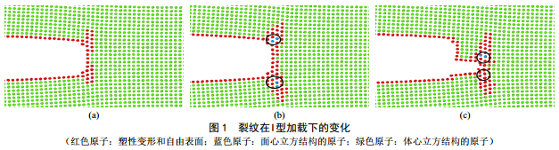 在無氫原子情況下,裂紋尖端優(yōu)先通過塑性變形釋放能量(圖 1中紅色原子),并隨著應變能持續(xù)增加,能量卸載方式會由塑性變形轉(zhuǎn)為相變(圖 1中藍色原子為相變原子),而只有當應力強度達到1.45 MPa·m0.5時,相變、塑性變形無法釋放過剩的應變能,鈍化的裂紋尖端開始產(chǎn)生微觀裂紋,材料失效。
