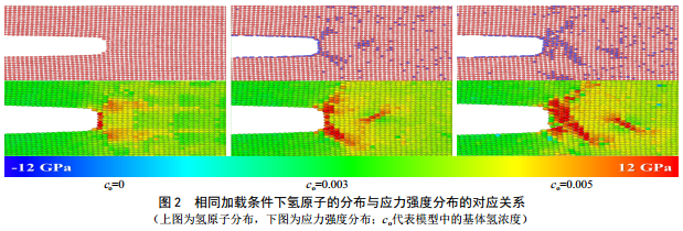 研究可知,在不存在氫原子的情況下,鐵釋放應變能的順序為塑性變形、位錯,最后才是破壞性最強的斷裂,而隨著氫原子的濃度升高,應力只在納米區(qū)域內(nèi)有較大集中,氫原子的引入對相變影響不明顯,斷裂卻被極大加強,最終當氫原子濃度達到一定數(shù)值時,斷裂變成卸載應變能的唯一方式,而這種情況是工程中最為危險的。