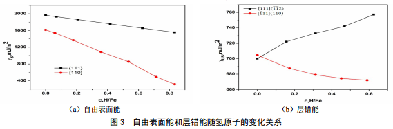 相變的發(fā)生主要依賴于溫度和內(nèi)應力的變化,氫原子對其影響不大。斷裂的發(fā)生主要依賴于自由表面能,位錯發(fā)射主要依賴于層錯能,因此自由表面能和層錯能受到關注和研究(圖 3)。