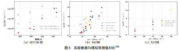 ,高強度的鋼,由于塑性區(qū)小,塑性變形產(chǎn)生的缺陷對氫原子的囚禁作用不明顯,氫擴散相關的裂紋擴展速率更多的依賴于HEDE機制,因此強度越高的鋼, n 的數(shù)值越接近于 1 。 此 觀 點 , 可 在 圖 5 中 被 印 證 , H Y 1 3 0 鋼(σys=932 MPa)不同溫度下的裂紋生長速率值,在 n 值為0.98時和預測值(空心點)較為吻合,而X65(σys=448 MPa)鋼材在n值為0.95時數(shù)據(jù)擬合較好,X52鋼材(σys=382 MPa) n值為0.88時數(shù)據(jù)都擬合較好。因此總裂紋擴展速率可以公式(7)表示。