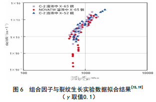 圖 6所示為C-2和NOVATW溶液中X65鋼中裂紋生長速率以及C-2溶液中X52鋼中裂紋生長速率與加載組合因子的關系, 其中γ取值為 0.1 時所有數(shù)據(jù)擬合結(jié)果較好。擬合的組合因子在X軸上存在一個門檻值500 MPa·m0.5,低于這個門檻值時,裂紋不會生長,呈現(xiàn)惰性;在500到1 000 MPa·m0.5 則為緩慢增長階段,屬于裂紋增長的激活區(qū);高于1 000 MPa·m0.5為裂紋快速增長階段。組合因子的這些門檻值可以直接用來預測微觀裂紋所處的狀態(tài),方便判斷管道所處的狀態(tài)和管道的維護。