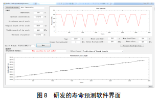 圖 8中展示了隨機生成的欠載譜圖,和計算剩余壽命前需要收集的數(shù)據(jù)。從譜圖中可以得到加載的應力強度變化和加載頻率等信息。初始輸入的數(shù)據(jù)為環(huán)境溫度(實測)、基體氫濃度(滲氫電流密度實驗)、材料的脆性參數(shù)(計算擬合,屈服強度越高越接近1)、裂紋的原始長度(管道內(nèi)檢測)、材料屈服強度、管壁厚度(實測);谝陨犀F(xiàn)場數(shù)據(jù)和管道內(nèi)應力變化,預測管道中裂紋長度。