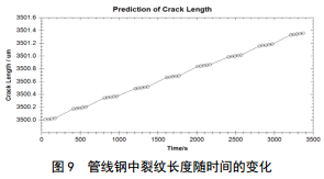 管道中的裂紋長度預測值如圖 9所示,裂紋長度預測值與管道壁厚的比值達到或者接近于三分之一, 則認為管道接近失效斷裂。管道斷裂裂紋長度的門檻值,取決于管道原始厚度、管材、運行溫度等因素,每種管材都需要通過實驗確定其斷裂門檻值,用于計算剩余壽命。