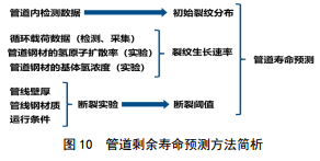 圖 10簡要概述了管道壽命預測的步驟,首先通過內(nèi)檢測,獲取管道初始裂紋狀態(tài);通過站場傳感器收集管道內(nèi)的應力變化情況;通過實驗和模擬得到氫原子擴散和濃度的基本參數(shù);通過斷裂實驗測得管道失效的閾值;結(jié)合軟件計算出的裂紋生長速度和裂紋長度變化,計算管道剩余壽命,每次內(nèi)檢測結(jié)束后,及時收集數(shù)據(jù),與模型之前的預測結(jié)果進行比較,反復驗證,通過機器學習的方法,可以使預測準確性不斷提高。