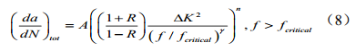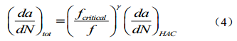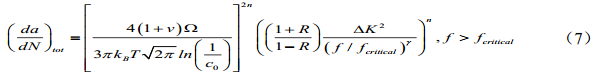 所示[15,16],是經(jīng)驗模型中比較完備且預測準確性較高的模型,然而此模型忽略了 加載頻率對裂紋生長的影響存在閾值,而且此模型無法準確量化外界環(huán)境,特別是溫度對于裂紋生長的影響。因此,理論模型的研發(fā)和對微觀斷裂機理的研究依然是一個科學難題。