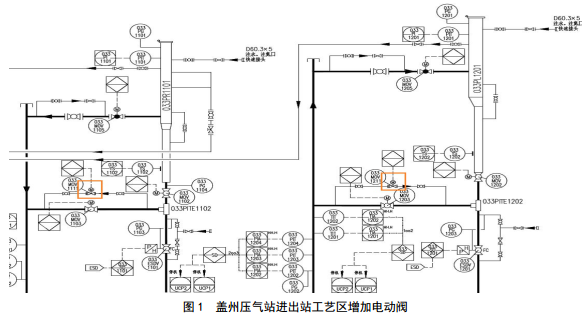 將進(jìn)/出站旁通管線上的平衡閥改為電動(dòng)并接入站控系統(tǒng)(圖 1),以改變以往在停站后干線與站內(nèi)壓差過(guò)大時(shí)只能依靠人工去緩慢平衡壓力的狀況,使壓差平衡過(guò)程可控,從而實(shí)現(xiàn)一鍵啟站時(shí)能夠自動(dòng)導(dǎo)通工藝流程。