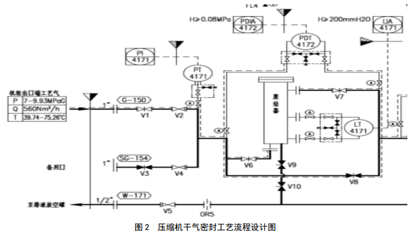 在原干氣密封備用氣源口位置,增加第二路工藝氣源引機(jī)組出口匯管工藝氣,增設(shè)一個(gè)氣動(dòng)閥門受壓縮機(jī)控制系統(tǒng)控制(圖 2)。當(dāng)壓縮機(jī)組進(jìn)行泄壓后的啟機(jī)時(shí),機(jī)組出口端工藝氣源已放空,需打開(kāi)該氣動(dòng)閥從壓縮機(jī)出口匯管供應(yīng)一級(jí)密封氣,泄壓停機(jī)時(shí)需關(guān)閉該氣動(dòng)閥,從而實(shí)現(xiàn)一鍵啟停站時(shí)干氣密封系統(tǒng)的自動(dòng)控制。