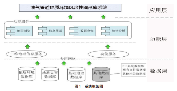 油氣管道地質(zhì)環(huán)境風(fēng)險(xiǎn)性圖形庫(kù)系統(tǒng)采用B/S+C/S的體系結(jié)構(gòu),以穩(wěn)定性和通用性為主導(dǎo),進(jìn)行分層設(shè)計(jì)與開(kāi)發(fā)。為了實(shí)現(xiàn)平臺(tái)的開(kāi)放性、靈活性、可擴(kuò)展性以及數(shù)據(jù)的可復(fù)用性,系統(tǒng)從邏輯上分為數(shù)據(jù)層、功能層和應(yīng)用層[5]。如圖 1所示。
