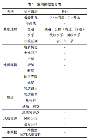 該系統(tǒng)數(shù)據(jù)類(lèi)別包括空間數(shù)據(jù)、屬性數(shù)據(jù)及文件數(shù)據(jù),其中空間數(shù)據(jù)分為基礎(chǔ)地理要素、地質(zhì)環(huán)境要素、管道要素、地質(zhì)災(zāi)害要素和三維模型五大類(lèi)。屬性數(shù)據(jù)分為系統(tǒng)元數(shù)據(jù)、空間矢量數(shù)據(jù)屬性、文件數(shù)據(jù)關(guān)聯(lián)數(shù)據(jù)三大類(lèi),每類(lèi)數(shù)據(jù)中又對(duì)應(yīng)多個(gè)屬性數(shù)據(jù)。文件數(shù)據(jù)分為現(xiàn)場(chǎng)照片、 CAD剖面圖、野外調(diào)查表EXCEL、音視頻文件、災(zāi)害治理相關(guān)文檔及其他以文件方式存儲(chǔ)的數(shù)據(jù)?臻g數(shù)據(jù)的構(gòu)成見(jiàn)表 1。