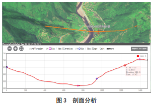 地形剖面分析用來(lái)分析地面上任意點(diǎn)間的坡度和高程情況,分析的結(jié)果是繪制出剖面圖。主要實(shí)現(xiàn)如下功能:繪制任意兩點(diǎn)間地形剖面圖;顯示剖面圖中的最大、最小坡度;定位任意一點(diǎn)在三維場(chǎng)景中的位置;顯示起始點(diǎn)的位置與高程信息;調(diào)整采樣點(diǎn)間距重新進(jìn)行計(jì)算。如圖 3。