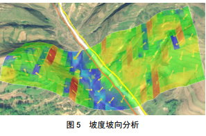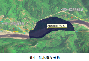 系統(tǒng)通過(guò)與用戶(hù)的交互,實(shí)現(xiàn)對(duì)三維場(chǎng)景中的任意范圍內(nèi)坡度坡向進(jìn)行分析,得出該范圍內(nèi)的坡度坡向圖,同時(shí)提供單點(diǎn)的坡度坡向信息查詢(xún)。淹沒(méi)分析功能實(shí)現(xiàn)顯示洪水淹沒(méi)面積范圍,可以清楚地確定洪水威脅的地方,對(duì)于高程低的地方可以劃為危險(xiǎn)區(qū)域,無(wú)論對(duì)防災(zāi)減災(zāi)還是災(zāi)后處理都有重要參考價(jià)值。見(jiàn)圖 4、圖 5。