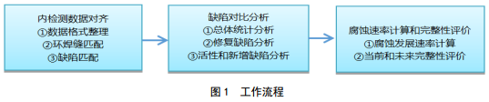 選擇某管道兩次內(nèi)檢測(cè)數(shù)據(jù)開(kāi)展比對(duì)分析,主要工作流程見(jiàn)圖 1。