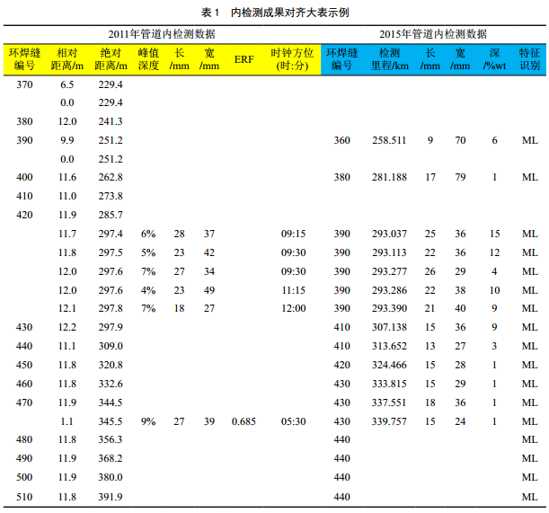 在環(huán)焊縫對(duì)齊成果的基礎(chǔ)上,根據(jù)相對(duì)距離和時(shí)鐘位置對(duì)兩次內(nèi)檢測(cè)報(bào)告的腐蝕缺陷進(jìn)行對(duì)齊和匹配。先采用軟件將缺陷位置信息初步進(jìn)行缺陷匹配,再人工進(jìn)一步分析對(duì)齊,必要時(shí)查看內(nèi)檢測(cè)原始信號(hào)進(jìn)行分析,得到內(nèi)檢測(cè)成果對(duì)齊大表,如表 1所示。