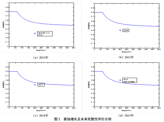基于腐蝕增長(zhǎng)速率,對(duì)未來(lái)幾年的管道完整性進(jìn)行評(píng)價(jià)得到管道剩余壽命,從而安排修復(fù)計(jì)劃,確定下次內(nèi)檢測(cè)時(shí)間。如某腐蝕缺陷2011年內(nèi)檢測(cè)報(bào)告深度為30% wt,經(jīng)過(guò)幾年增長(zhǎng)到2015年超過(guò)評(píng)價(jià)允許尺寸,應(yīng)在年底前進(jìn)行修復(fù)(圖 2)。