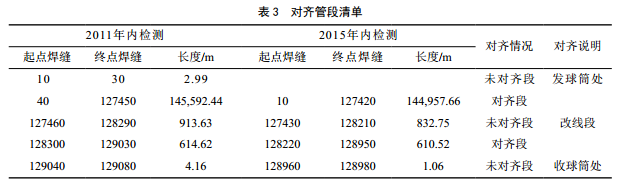 因兩次內(nèi)檢測(cè)的起點(diǎn)和終點(diǎn)不同和改線(xiàn)管道,存 在未對(duì)齊管段,其他則可以對(duì)齊,即內(nèi)檢測(cè)數(shù)據(jù)具備對(duì)齊條件,對(duì)齊可行。
