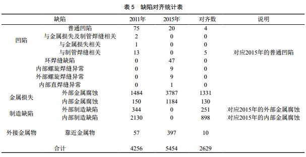 2015年與2011年的檢測(cè)商不同,在缺陷分類(lèi)上存在一定差別。人工根據(jù)位置判斷以下類(lèi)別為同一缺陷:即對(duì)正常管段內(nèi)的缺陷進(jìn)行對(duì)齊,參數(shù)為里程容差0.4 m,時(shí)鐘方位小于45:00可接受,共對(duì)齊2 629個(gè)缺陷,對(duì)齊率48.2%(表 5)。