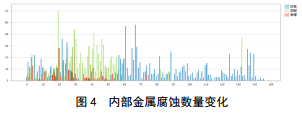2011年內(nèi)部金屬腐蝕覆蓋全線(xiàn)、 2015年內(nèi)部金屬腐蝕集中在0―55 km處,此管段對(duì)齊率為63%,總體數(shù)量減少1 096個(gè)(圖 4)。