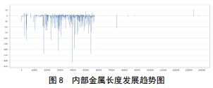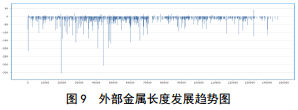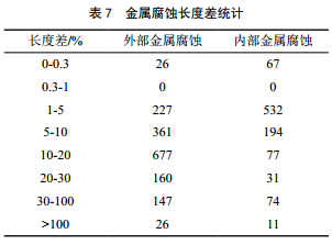 長(zhǎng)度發(fā)展趨勢(shì): 2015年缺陷的內(nèi)/外金屬腐蝕長(zhǎng)度普遍比2011年缺陷小,且存在降幅較大缺陷,只有少量缺陷的長(zhǎng)度為正增長(zhǎng)(圖 8、圖 9),長(zhǎng)度差統(tǒng)計(jì)如表 7所示。