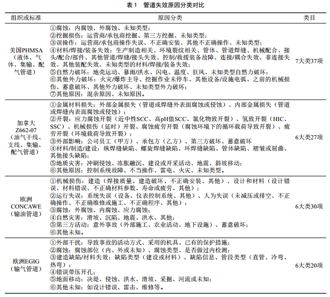 在風(fēng)險(xiǎn)評價(jià)過程中,失效數(shù)據(jù)的統(tǒng)計(jì)非常重要,通過對管道失效的歷史數(shù)據(jù)進(jìn)行統(tǒng)計(jì)與分析,可以使管道危害因素分類更為合理。表 1是國外管道失效數(shù)據(jù)庫中對管道失效原因的對比與分類,其中已包括美國運(yùn)輸部管道與危險(xiǎn)材料安全管理局(PHMSA)、加拿大標(biāo)準(zhǔn)協(xié)會(CSA)、歐洲輸油管道(CONCAVE)和輸氣管道(EGIG)等國際主要的管道失效數(shù)據(jù)庫[1-6]。
