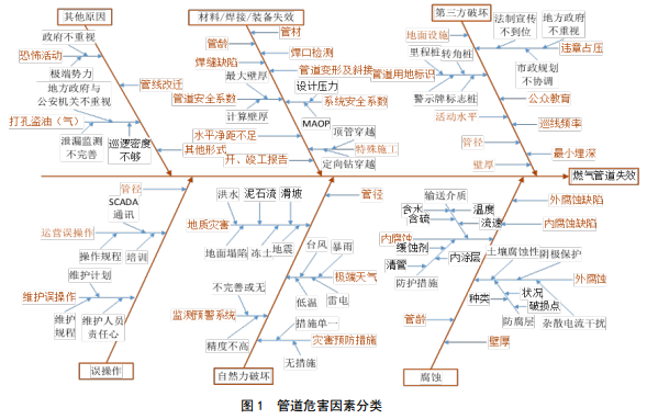 綜合上述情況,并考慮到我國油氣管道的具體情況,將管道危害因素分為腐蝕、自然力破壞、第三方破壞、材料/焊接/裝備失效、誤操作及其他原因等6大類,每類又與諸多因素有關(guān),用魚骨圖細(xì)化了各類危害因素,如圖 1所示。