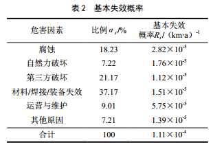 基本失效概率需要通過大量的統(tǒng)計(jì)資料獲得。統(tǒng)計(jì)資料來源于油氣管道事故的歷史記錄,如油氣管道失效數(shù)據(jù)庫。根據(jù)前面對各數(shù)據(jù)庫油氣管道事故的分類統(tǒng)計(jì),按照式(2),計(jì)算得到油氣管道基本失效概率如表 2所示。