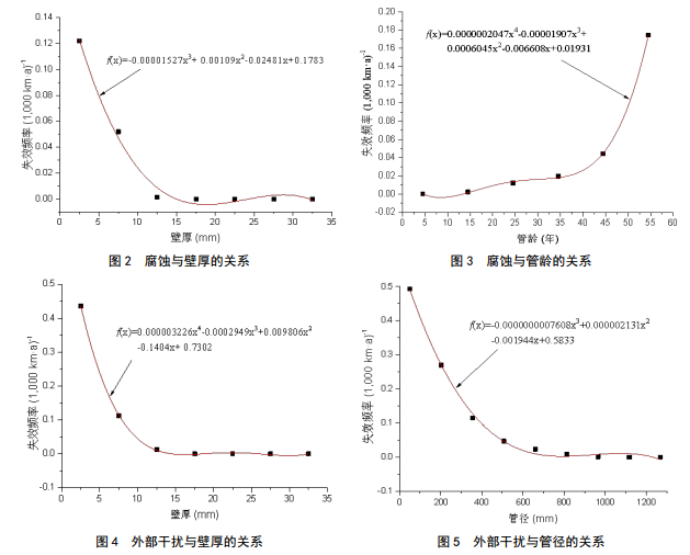 定量指標(biāo)需要大量的統(tǒng)計(jì)數(shù)據(jù)做支撐。通過分析管道失效數(shù)據(jù)庫,可以得到壁厚、管徑、管齡、埋深、鋼級等參數(shù)與管道失效概率間的關(guān)系,如圖 2―5,擬合成函數(shù),從而得到這些參數(shù)與失效概率間的函數(shù)關(guān)系,即定量關(guān)系。