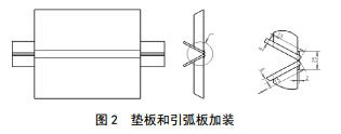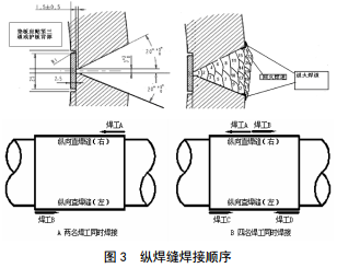 焊接前必須在縱焊縫兩側(cè)墊板上加裝引弧板,加裝方法見圖 2。兩道縱焊縫同時(shí)進(jìn)行預(yù)熱及焊接,焊接方向見圖 3。預(yù)熱溫度要求100 ℃以上,根焊、熱焊后自然冷卻,進(jìn)行干式磁粉檢測;填充50%后焊接退火焊道,自然冷卻,第二次干式磁粉檢測;縱焊縫填充蓋面最后焊接回火焊道,自然冷卻后濕式磁粉、超聲、相控陣檢測。焊接過程中所有焊道接頭要錯(cuò)開。