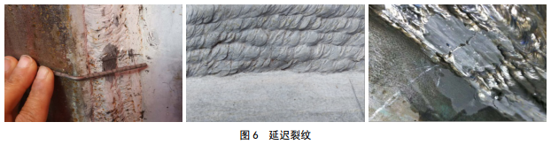 延遲裂紋(圖 6)主要來自三大因素:一是氫的存在,二是應(yīng)力存在,三是有氫致開裂傾向的焊接組織,典型特點(diǎn)是硬度過高,原因是碳當(dāng)量過高、冷速太快。