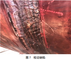 圖 7中焊縫外觀成型差,這與焊縫質(zhì)量有直接關(guān)系,如焊工水平、是否按規(guī)程操作等。焊接電流過大或焊接速度過快易導(dǎo)致咬邊,圖 7劃線處,咬邊處極易產(chǎn)生焊趾裂紋。