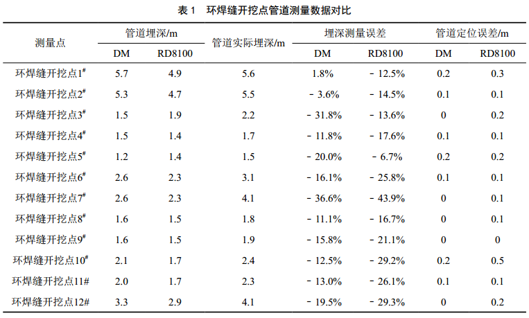 選取12個(gè)環(huán)焊縫開(kāi)挖點(diǎn)位的測(cè)量數(shù)據(jù)用于比對(duì)分析(表 1), DM在測(cè)量管道埋深時(shí)整體誤差為﹣36.6%~1.8%(負(fù)值代表測(cè)量數(shù)值比實(shí)際深度小,下同)。其中10個(gè)點(diǎn)位(占樣本量的83.3%)的測(cè)量誤差為﹣20%~1.8%,測(cè)量誤差絕對(duì)值的平均值為12.5%;另外兩個(gè)點(diǎn)位(占樣本量的16.7%)受高壓線(xiàn)影響相對(duì)突出,深度測(cè)量誤差達(dá)到﹣ 31.8%和﹣36.6%。 RD8100在測(cè)量管道埋深時(shí)整體誤差為﹣43.9%~﹣6.7%,其中6個(gè)點(diǎn)位(占樣本量的50%)測(cè)量誤差絕對(duì)值超過(guò)了21%。所有樣本量的測(cè)量誤差絕對(duì)值的平均值為21.4%。由此可見(jiàn),管道定位RD 8100與DM都較準(zhǔn)確,但RD 8100測(cè)量管道埋深可能會(huì)因?yàn)楦浇懈邏壕(xiàn)或并行管線(xiàn)影響導(dǎo)致測(cè)量結(jié)果有較大偏差,而DM測(cè)量的結(jié)果就相對(duì)準(zhǔn)確。