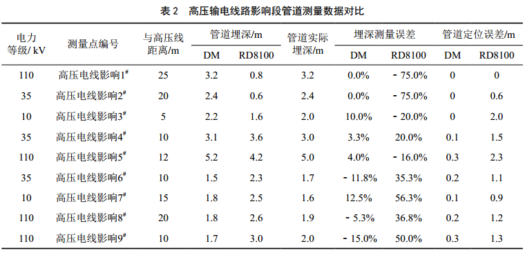 在高壓線(xiàn)影響管段采集9個(gè)點(diǎn)位的數(shù)據(jù)用于比對(duì) 分 析 ( 表 2 ) , D M 在 測(cè) 量 管 道 埋 深 時(shí) 整體誤差為﹣15%~12.5%。其中有8個(gè)點(diǎn)位(占樣本量的89%)的測(cè)量誤差為﹣11.8%~12.5%,測(cè)量誤差絕對(duì)值的平均值為5.9%;另外1個(gè)點(diǎn)位(占樣本量的11%)受高壓線(xiàn)影響相對(duì) 突 出 , 深 度 測(cè) 量 誤 差 絕對(duì) 值 達(dá) 到 1 5 % 。 R D 8 1 0 0 在 測(cè) 量 管 道 埋 深 時(shí) 整 體誤差為﹣75%~56%,其中4個(gè)點(diǎn)位(占樣本量的44.4%)測(cè)量誤差絕對(duì)值超過(guò)了50%, 6個(gè)點(diǎn)位(占樣本量的66.7%)測(cè)量誤差絕對(duì)值超過(guò)了35.3%,全部樣本的測(cè)量誤差絕對(duì)值的平均值為42.7%,整體誤差較大。由此可見(jiàn), RD 8100在高壓線(xiàn)附近受影響較大,測(cè)量管道位置和埋深數(shù)據(jù)都會(huì)出較大的偏差;DM在高壓線(xiàn)附近受影響較小,測(cè)量管道位置和埋深數(shù)據(jù)偏差都較小,而且在有高壓線(xiàn)干擾的時(shí)候, DM的測(cè)量數(shù)據(jù)更加穩(wěn)定,不會(huì)出現(xiàn)RD 8100測(cè)量時(shí)出現(xiàn)的數(shù)據(jù)大范圍跳動(dòng)的情況。