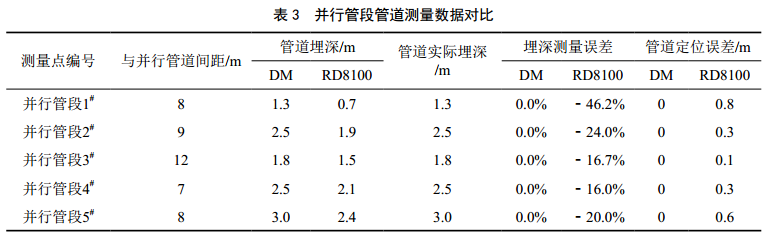 在管道并行區(qū)段選取5個(gè)點(diǎn)位的數(shù)據(jù)用于比對(duì)分析(表 3), DM在測(cè)量管道埋深和管道位置時(shí)誤差基本為零。 RD 8100在測(cè)量管道埋深時(shí)整體偏差達(dá)到﹣16%~﹣46.2%,其中1個(gè)點(diǎn)位(占樣本量的20%)測(cè)量誤差絕對(duì)值達(dá)到了46.2%,其他4個(gè)點(diǎn)位(占樣本量的80%)測(cè)量誤差為﹣16%~﹣24%, 80%樣本量的測(cè)量誤差絕對(duì)值的平均值為19.2%,整體誤差較大;在測(cè)量管道位置時(shí)偏差為0.1~0.8 m。由此可見(jiàn), RD 8100在測(cè)量時(shí)易受并行管段的影響,測(cè)量結(jié)果偏差較大,以往甚至發(fā)生過(guò)測(cè)量結(jié)果是其他并行管道的情況。 DM在測(cè)量時(shí)基本不受并行管道的影響,無(wú)論是管道位置還是埋深,與開(kāi)挖驗(yàn)證數(shù)據(jù)基本一致。