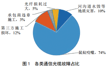 管道通信光纜與管道同溝鋪設(shè),埋深一般在地表面下 1.0~1.5 m。通信光纜故障可分為光纜中斷、光纜斷芯和損耗過大[1]。光纜中斷故障一般是外載荷作用力導(dǎo)致,地表特征明顯,易于發(fā)現(xiàn)。光纜斷芯或光纖損耗過大等常見故障地表沒有明顯特征,故障點(diǎn)的查找和定位比較困難。如圖 1所示,某管道公司近3年累計(jì)發(fā)生通信光纜故障56起,其中因鼠蟻咬噬導(dǎo)致光纜斷芯及光纖損耗過大等光纜故障占比達(dá)79%。