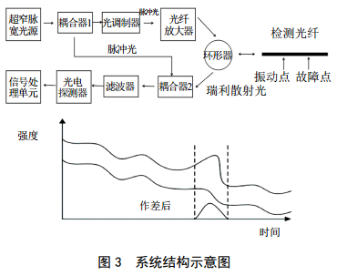 φ-OTDR系統(tǒng)主要由超窄脈寬光源、光耦合器、光調(diào)制器、光纖放大器、環(huán)形器、檢測光纖、光電探測器、信號(hào)處理單元等部分組成。檢測光纖由硅管保護(hù),沿地下管道埋地鋪設(shè)。超窄脈寬光源發(fā)出的光經(jīng)耦合器1分成兩部分,一部分進(jìn)入光調(diào)制器形成脈沖信號(hào),經(jīng)過摻鉺光纖放大器(EDFA)進(jìn)行功率補(bǔ)償后,通過環(huán)形器注入檢測光纖,另一部分作為本地光信號(hào),與后向瑞利散射光在耦合器2進(jìn)行拍頻,以提高散射光強(qiáng)度,濾除噪聲,增加探測距離,拍頻后的光信號(hào)經(jīng)濾波器濾除不同散射益的光信號(hào)后,經(jīng)光電探測器捕捉再進(jìn)入信號(hào)處理單元進(jìn)行數(shù)據(jù)處理,如圖 3所示。