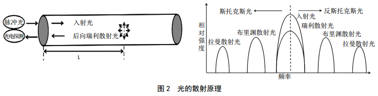 光時(shí)域反射儀(Optical Time Domain Reflectometer, OTDR)是當(dāng)前通信光纜維護(hù)最常用、最便捷的工具。它是基于光在光纖中傳輸過程中的后向瑞利散射和菲涅爾反射原理。如圖 2所示。激光器發(fā)出的光在光纖傳播過程中,受光纖材質(zhì)不均勻性影響,光子與纖芯晶格間發(fā)生碰撞會(huì)產(chǎn)生散射效應(yīng)。包括瑞利散射、拉曼散射、布里淵散射。當(dāng)光纖鏈路中有非常規(guī)能量損失點(diǎn)時(shí),后向瑞利散射光特性會(huì)發(fā)生明顯變化,通過檢測后向散射光能量的大小用以定位傳輸衰減故障點(diǎn)。當(dāng)光纖鏈路中有斷點(diǎn)時(shí),光會(huì)在斷點(diǎn)處產(chǎn)生菲涅爾反射,通過檢測光信號(hào)即可定位光纖斷點(diǎn)位置。