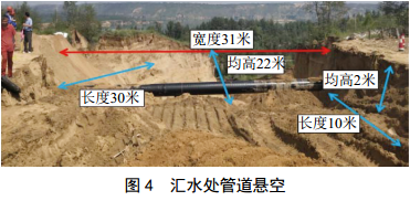 某管段位于匯水地段,經(jīng)過(guò)雨水沖刷,管道前方出現(xiàn)坍塌,導(dǎo)致坡體出現(xiàn)整體滑坡,管道懸空(圖 4)。治理措施如下。
