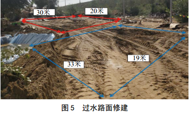 (4)排水渠前方地面使用素混凝土硬化,形成過(guò)水面,過(guò)水面正面及左側(cè)使用1.5 m齒墻保護(hù)(圖 5)。