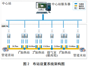 在某油田輸油管道(中間設置加熱站3座)安裝一套S-image次聲波管道泄漏監(jiān)測系統,由中心主站、監(jiān)測子站兩部分組成,五個監(jiān)測子站即管道首站-1#加熱站-2#加熱站-55公里處排氣室-3#加熱站-管道末站。布站設置系統架構見圖 2。