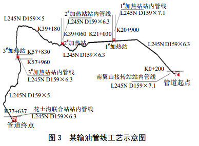 監(jiān)測管道長80 km,管線規(guī)格為D159×6.3,材質為L245N無縫鋼管,輸送介質為凈化原油,管道高程為2 719 m~3 377 m。其工藝示意圖見圖 3。